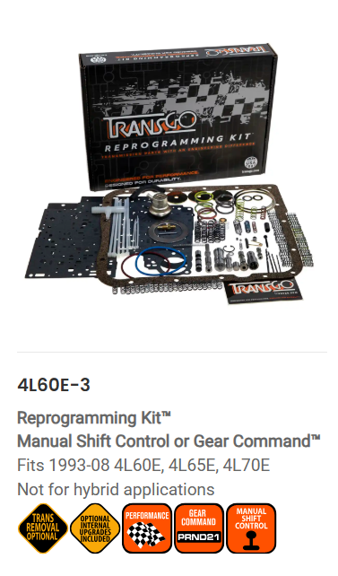 The TransGo SK4L60E kit is the standard repair and performance improvement option for the 4L60E. It corrects common transmission problems such as harsh or delayed shifts, 3–4 clutch burn-up, and torque converter shudder. This kit recalibrates the hydraulic circuits and installs without removing the transmission, making it ideal for daily drivers and general 4L60E repairs.